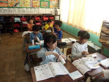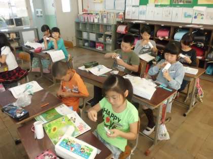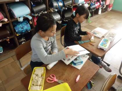 これまでに学習したことをもとに,動くおもちゃを作りました。ゴムと粘土,クリップ,トイレットペーパーの芯を使い,「もどってくる車」を作りました。教科書をしっかり見て,作り方を確認しています。