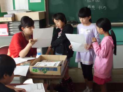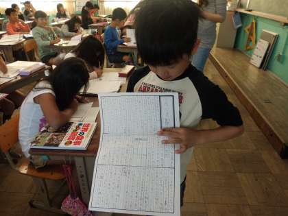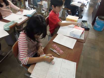 本やインターネットで調べた外国の文化を,新聞にまとめていきます。わりつけを考え,丁寧に書いています。下書きができたら先生にチェックしてもらっています。完成が楽しみですね。