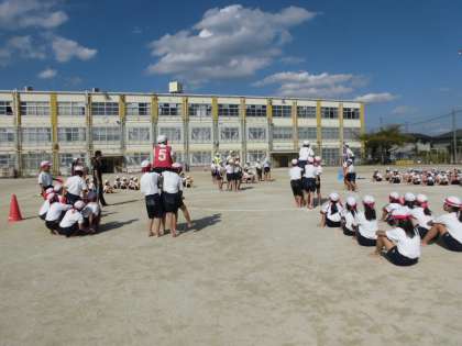 5年生は騎馬戦の練習です。一騎討ち・勝ち抜き戦・大将戦の3回戦があります。それぞれ作戦を立てて戦っていますが,かけひきが見ていておもしろいですね!