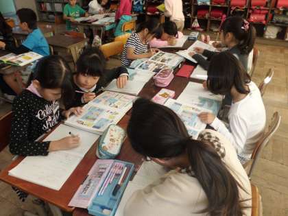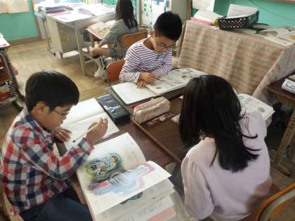 牛乳やとうもろこしなど,すがたをかえて食べられるものについて調べています。説明文を書くために,みんながんばってね。