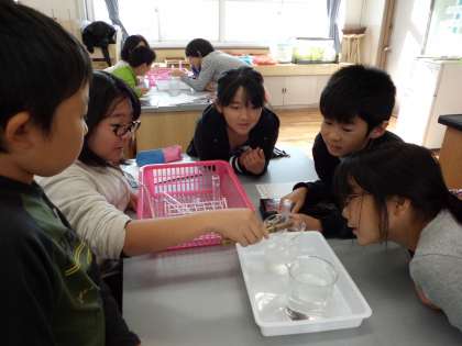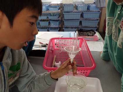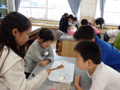 4年生になって初めて理科室で実験をしました。みんな少し緊張気味でしたが,