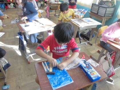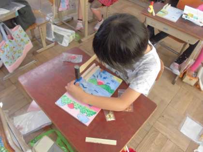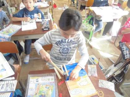 その2。下絵が完成したら,いよいよ金づちを使って,くぎを打っていきます。トントンと釘を打つ音が教室中にひびきます。みんな上手にできています。
