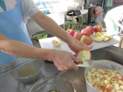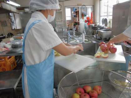 給食室では,りんご(12g)を洗って,八ツ割にして芯を取り除き,
