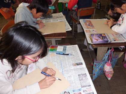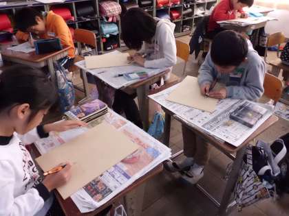初めて取り組む木版画。彫刻刀の使い方学習して,緊張しながら彫っていました。
