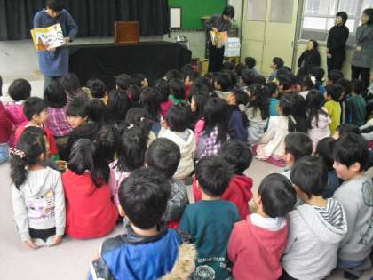 今日は「ねずみのすもう」と「オナラせんせい」の読み聞かせをしていただきました。とっても楽しいお話で,みんなにこにこ笑顔でした。