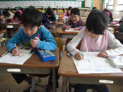 今日の生活は、見つけたよカードを書いています。先日行われた「むかしあそびの会」をふりかえって、できるようになったことや楽しかったことたくさん書いています。きっととても楽しかったんでしょうね。