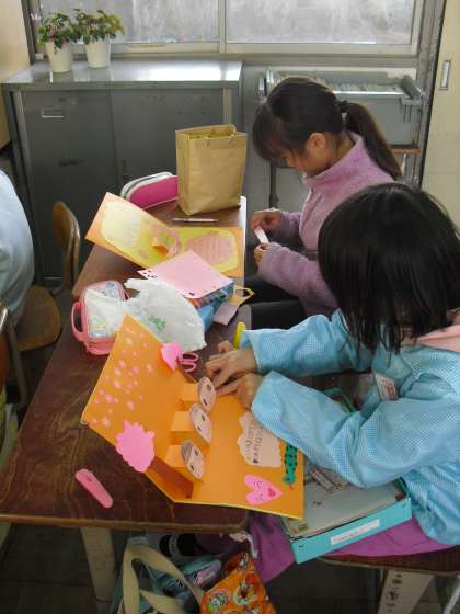 今日の図工は「とびだすメッセージ」です。3Dがちまたでは流行している今日この頃ですが、この作品は、3Dメガネがなくても、ちゃんと心のこもったメッセージがとびだします。だれにプレゼントしようかな?