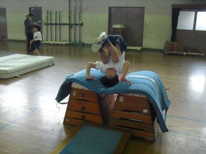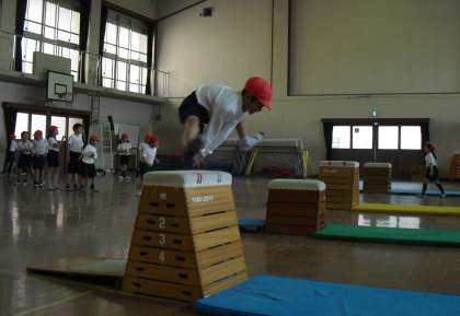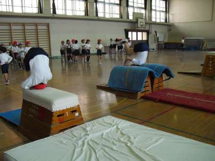 今日の体育は「とびばこあそび」です。いろいろ工夫された場で、みんな一生懸命頑張っています。たくさん跳べたよね!