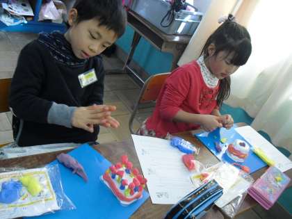 幸せいっぱいの2組は、みんなでウエディングケーキを、あっ失礼、紙粘土でケーキを作りました。