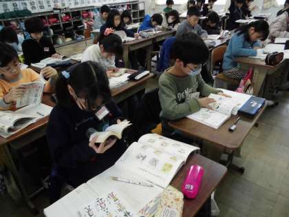 学校のことわざ辞典を使用しています。カラーのわかりやすく楽しい辞典なので、子ども達も他にもどんなことわざがあるのかなど、ことわざに興味が深まったようです。また、自宅から自発的に辞典を持参して、いろんな辞典を使用している人も何人かいます。 みんな集中してことわざの意味について調べています。