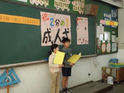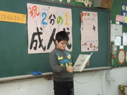 今日は,本年度最後の参観日です。総合的な学習の「2分の1成人式」の発表会をしました。幼い頃のエピソード・家族へのおもい・将来の夢について発表しました。