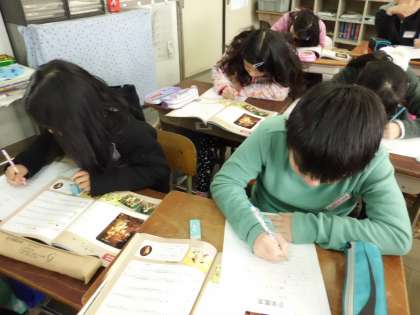 今日は,音楽の鑑賞をしました。声の響きの違いや、声の重なり,会話のような呼びかけ合いに気づきながら鑑賞しました。