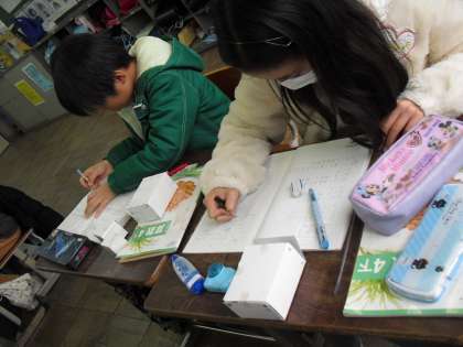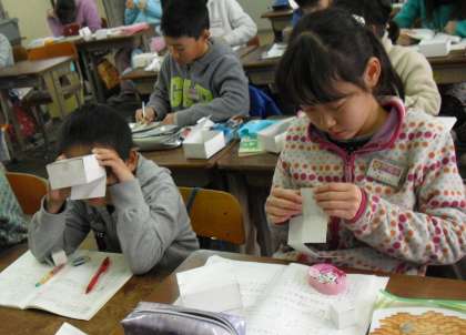 今日の算数のめあては「直方体の辺と辺の関係を調べよう」です。自分たちで作った直方体を手がかりに辺の関係を調べていきます。よーくのぞきこんで、しっかり見つけてくださいね!