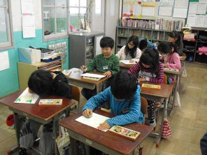 6年生の卒業式に向けて,掲示物をつくっています。お祝いの気持ちをこめて,絵をかきました。