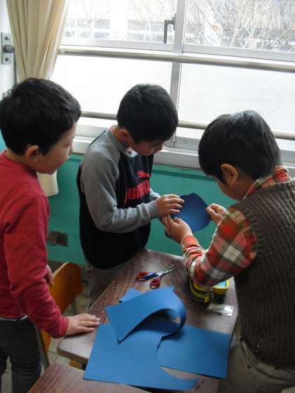 今日はお楽しみ会に向けての練習をしました。みんなで仲よく、グループの出し物に取り組んでいます。