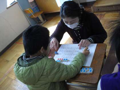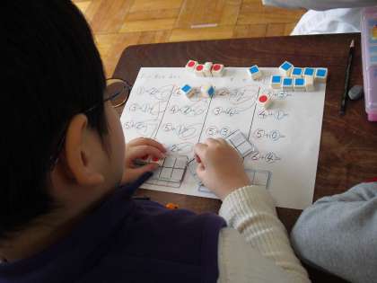 今日の算数は「たし算とひき算」です。数図ブロックを使いながら、足したり引いたりする計算を考えます。みんながんばってるよね!