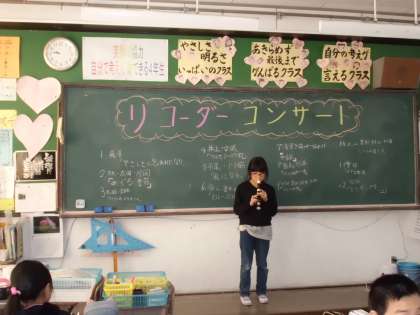 今日は,クラスみんなで1年間がんばって練習してきたリコーダーの発表会をしました。グループや個人でお気に入りの曲を演奏しました。最後に今までの曲を全曲演奏しました。最初の頃は難しかった曲も,今では簡単に演奏することができるようになりました。みんなの努力に大きな拍手をおくります!!