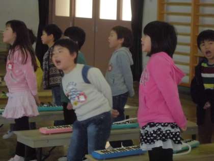 新しい1年生を迎えるために一生懸命,練習を重ねています。元気がよくてかわいい声でした。けんばんハーモニカやすずもつかいます。がんばってるね!