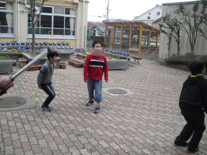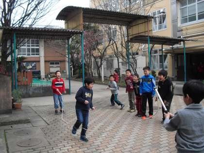 今日は気温が高くなり、外で遊ぶにはもってこいの1日です。中間休みには、みんなで仲よく遊んでいます。