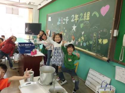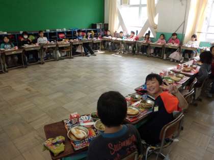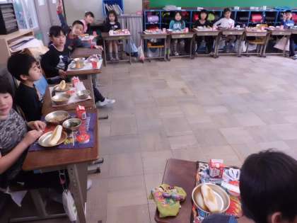 今日はいつもおいしい給食を作ってくださる調理員さんを,教室に招待しました。