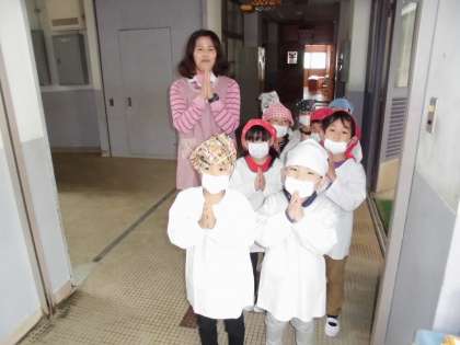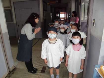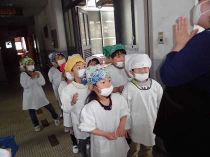ぴかぴかの1年生のかわいい給食当番さんが,そろって給食室に給食を受け取りに来ました!