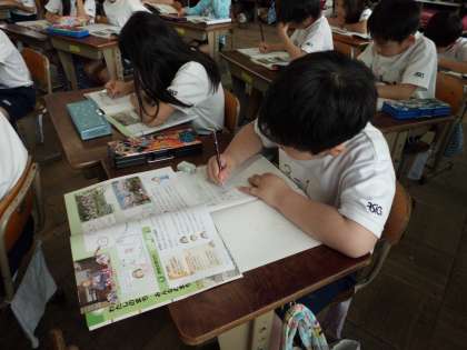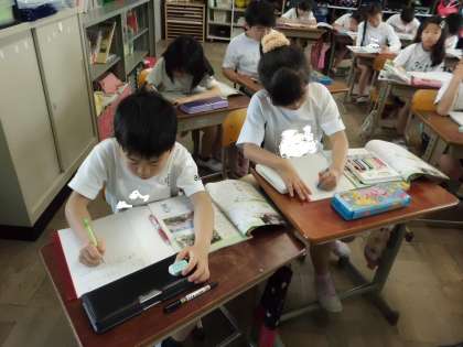 今日は初めての社会科の学習をしました。「わたしたちのまち」という学習で,自分の家の近くの,お気に入りの場所をしょうかいしました。地図をかいたり,文章で説明したり,思い思いに表現していました。
