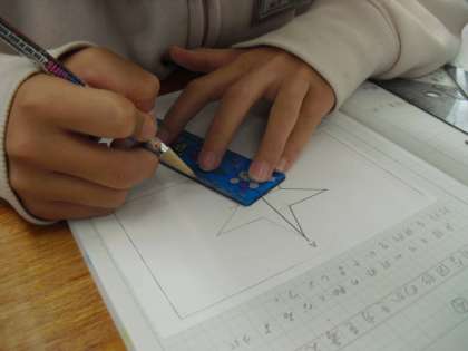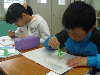 線対称な図形の性質を生かして,線対称な図形を作図しました。三角定規やコンパスを上手に使って作図することができました。