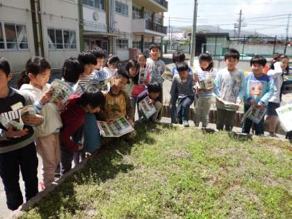 今日はいいお天気にめぐまれました。運動場に行って,「春みつけ」をしました。オオイヌノフグリや,カタバミ,ナガミヒナゲシなど,たくさん植物をみつけていました。「花の小道だ」と言いながら,お花とお花の間をとおっている人もいました。