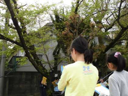 今日は校庭のサクラを観察しました。4月のはじめと比べてすっかり花は散り、かわりに瑞々しい葉が顔を出していることがわかりました。これから季節ごとの変化を観察して記録していきます!