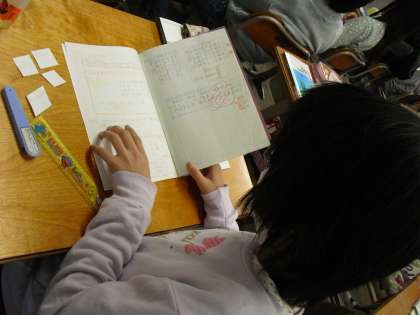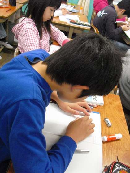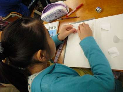 先ほどの写真によーく似ていますが、こちらは算数の学習です。切り取った図形を用いて、対称の軸と中心をみつけています。もちろん、算数の学習も楽しかったよね!