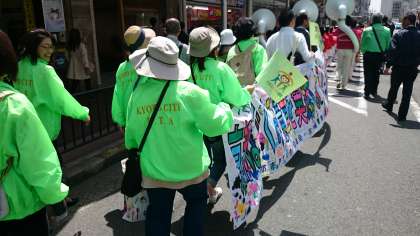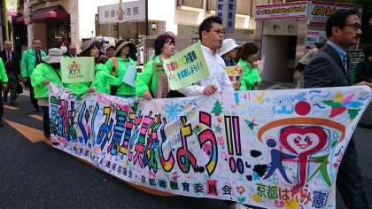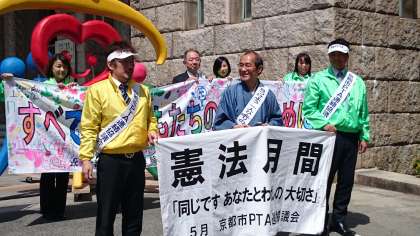 18日に京都市PTA連絡協議会人権啓発パレードがあり,市役所前から総合教育センターまでのパレードに,PTA会長と校長が参加しました。テーマは「同じです あなたとわたしの大切さ」(人権月間),はぐくみ憲章を実践しよう(市P連)」。市民ぐるみの共育の一環です。