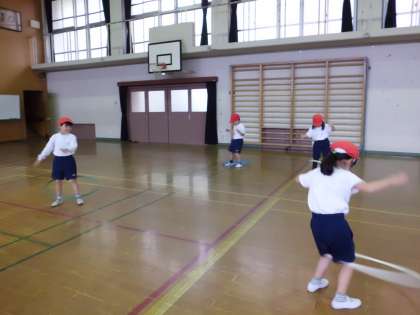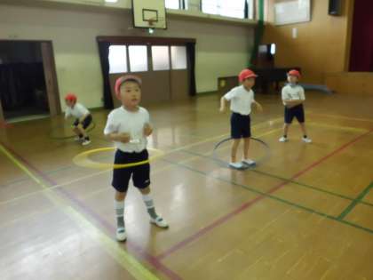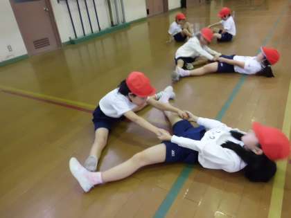 今日の体育は,フープを使ってあそびます。前回よりも長く回せるようになったかな?また,二人組で手をつないで,体を曲げたり,お互いにゆっくり引っ張ったりして遊びました。「いたたたたたた。」と言っている人もたくさんいましたね。