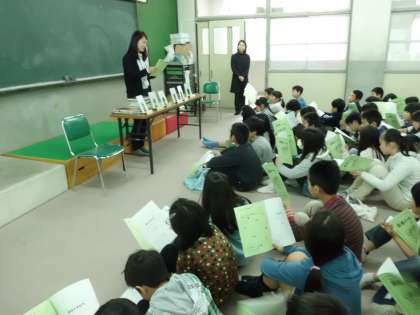4年生は,図書館支援員の先生に,図書室の使い方について教えていただきました。本には,なぜ分類番号があるのか,本の見つけ方などについて話をしてくださいました。お話のあとに,読みたい本を選びました。