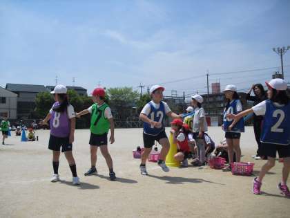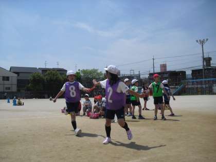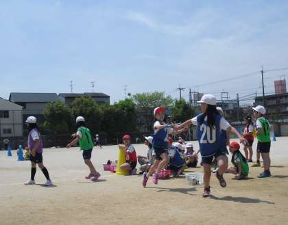 4年生の体育はリレーです。がんばって練習したバトンパスも、もうバッチリ!目指すは東京五輪です!!