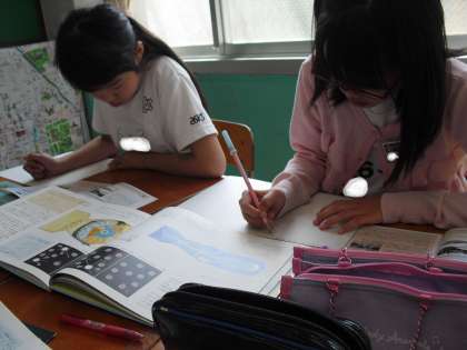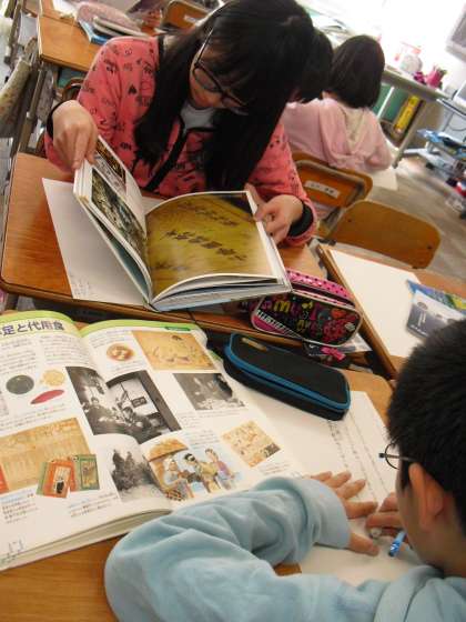 6年生の総合的な学習のテーマは「平和・ひと・いのち」です。今日は戦争について、課題ごとにグループで集まり調べていきました。