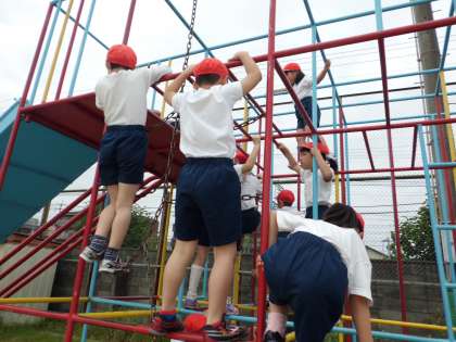 今日は総合ゆうぐやつき山であそびました。総合ゆうぐでは,「こわい。」と言いながらも,初めて3階までのぼった人もいましたね。休み時間でもきまりをまもって安全にあそびましょう。