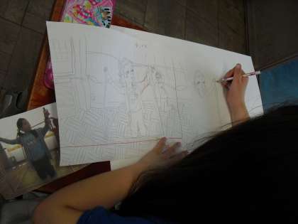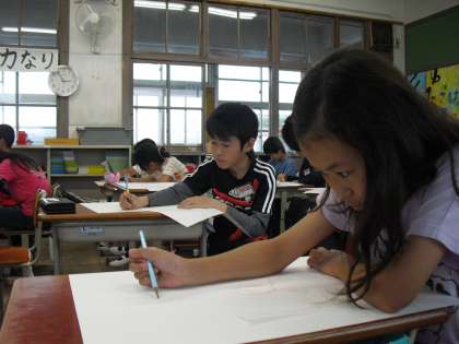 今日の図工は、いよいよ画用紙に描いていきます。構成を考えながら、みんな真剣に取り組んでいます。
