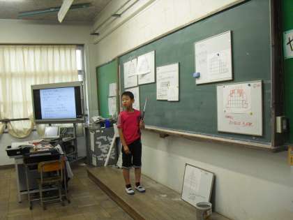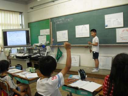 今日の算数は「わくわく算数学習」。色板の数を工夫しながら求めていきます。自分の考えをうまく説明できましたか?