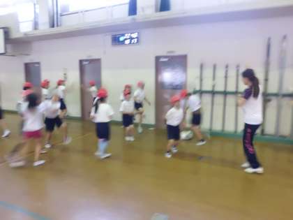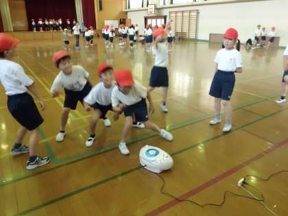 今日は,3クラス合同で授業をしました。たくさんの友だちと,のりのりで体を動かしました。あれ?先生も一緒に踊っていますね。