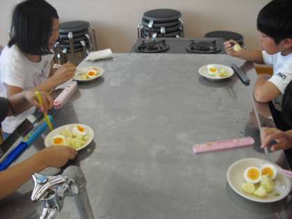 沸騰後,3分,5分,10分,15分と時間をはかって取り出し,卵は割ってみて,ジャガイモは竹串でさしてみて,変化を観察しました。