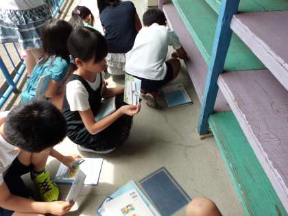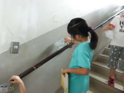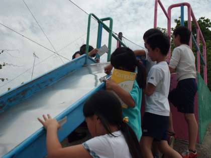 かたむき分度器を使って,すべり台や階段のかたむきを調べました。子ども達は図る前に予想を立てていましたが…。予想よりは,角度が小さかったですね。