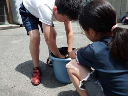 土と水と肥料を入れたら,よくよく,かき混ぜて,かき混ぜて…