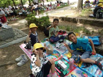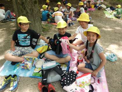いよいよ待ちに待ったお弁当です!京都駅から梅小路公園まで歩いて,おなかがぺこぺこになりました。「充電がきれたよ〜。」「おなかがぺこぺこだよ〜。」みんなそろっていただきます!おつかれさま!乾杯!