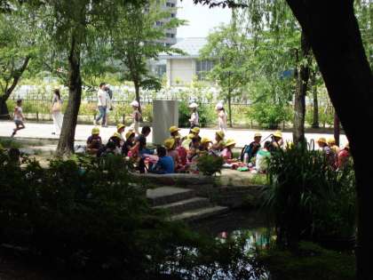 こんなに素敵な場所でお弁当を食べました。さて,帰りはバスにのって帰ります。おやおや。お疲れの人たちがいますね。おおい。帰りますよ!電車と同じように,ルールを守ってのれるかな?
