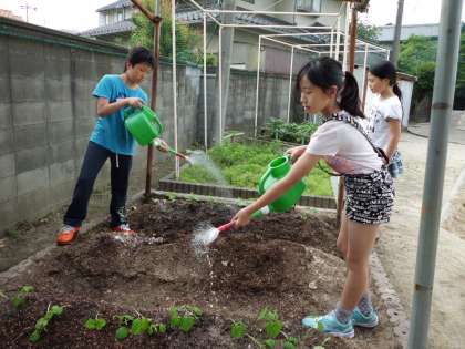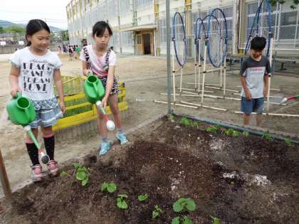 昨日ツルレイシの植え替えをしたので,今日から当番が水やりを始めました。早く大きな実がなったらいいなあ〜。