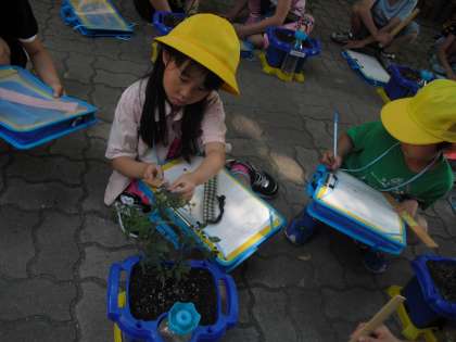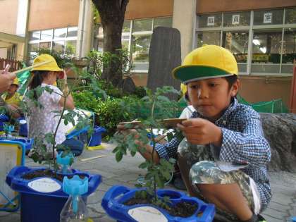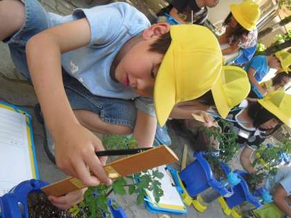 今日はミニトマトの観察しました。みんなでものさしをもって、どれだけ成長しているか、調べました。はやく収穫できるといいね。