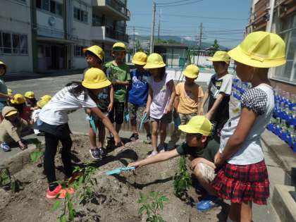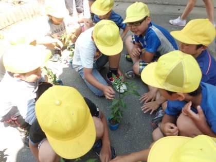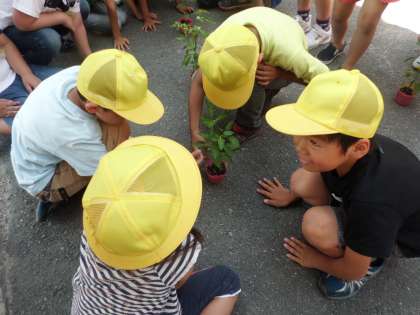 今日は,万願寺とうがらし,伏見とうがらし,賀茂なすの苗を観察して,花壇に植えました。これから毎日水をやって,育てます。早く食べたいですね。