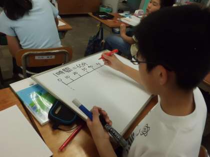 時計を見たり,図をかいたりと知恵をしぼって考えています。