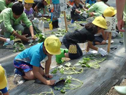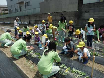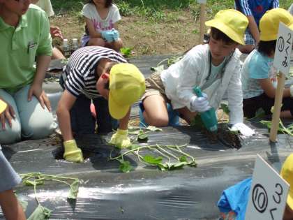 楽しみにしていたさつまいもの苗うえです。桂高校の畑をお借りして,お兄さん,お姉さんと一緒にさつまいもを植えました。植え方や,さつまいものなえについてなどやさしく教えていただきました。「これのどこからさつまいもができるの。」と不思議そうな様子も見られました。これから頑張って水やりに行きましょう。大きなおいもができるといいね。