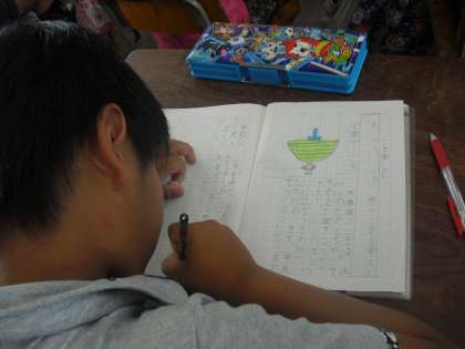 今日の国語のめあては「あったらいいなと思うこまを考えよう」です。水面を回る「水面まわりごま」に、大きくとびはねることのできる「バネごま」、男子に人気の対決「バトルごま」などたくさんのこまがありました。宝物がどっさり出てくる「ひらけごま」なんてのもいいと思うんですがねー。